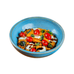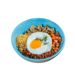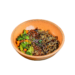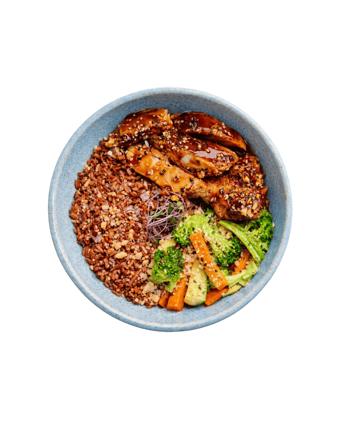 Tiras de frango grelhado salteadas no molho teriyaki, arroz vermelho e legumes da estação salteados. Para finalizar, um toque de gergelim e nuts crocantes.