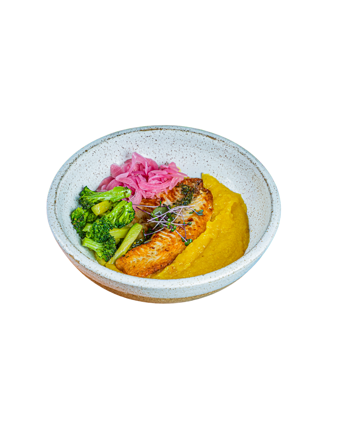 Filé de Saint Peter grelhado ao azeite de ervas, purê de mandioquinha, legumes salteados(abobrinha e brócolis) e picles de cebola roxa.