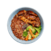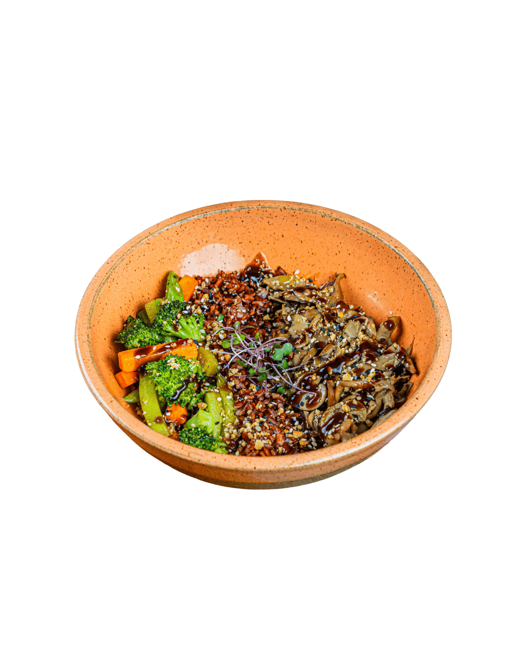 Mix de cogumelos  no molho teriyaki, arroz vermelho e legumes da estação salteados. Para finalizar, um toque de gergelim e nuts crocantes.