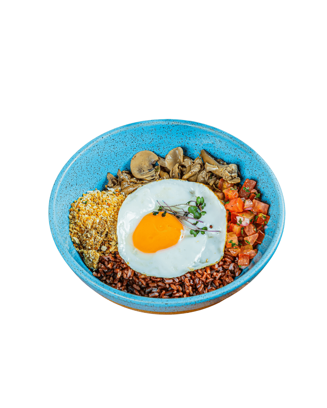 Picadinho de Cogumelos com arroz vermelho, farofa crocante de banana, vinagrete e ovo feito estrelado.
